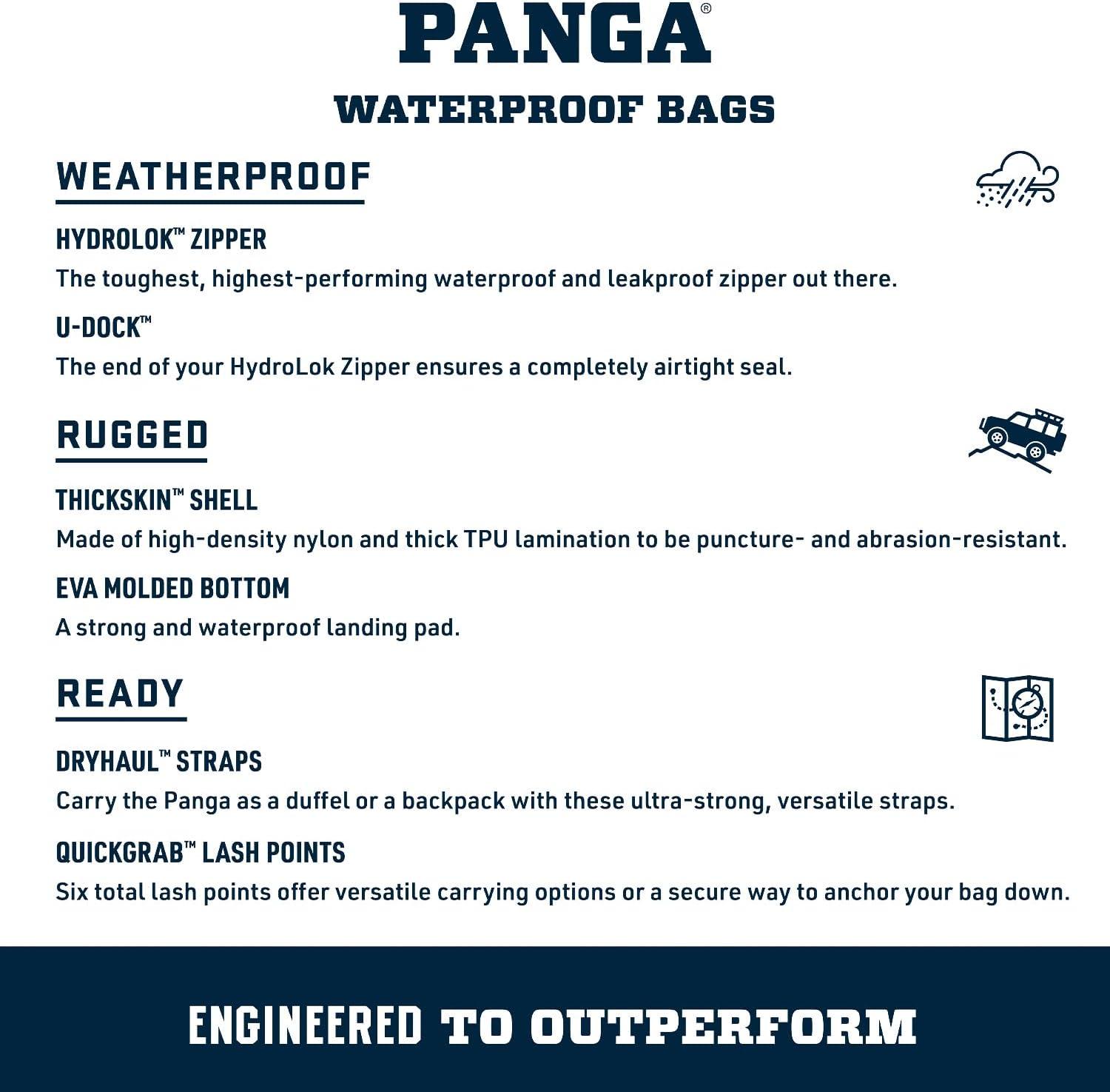 The Panga Backpack is an airtight citadel merging the durability of the Panga Duffel with a tried-and-true backpack design. Its ergonomic DryHaul Shoulder Straps offer extra carrying comfort, while the removable chest straps and waist belt provide added stability and security while you trek. And no need to carry it over your head while you wade or blink an eye if left out in the rain, because it's a 100% waterproof gear fortress equipped to outperform any other backpack out there.
