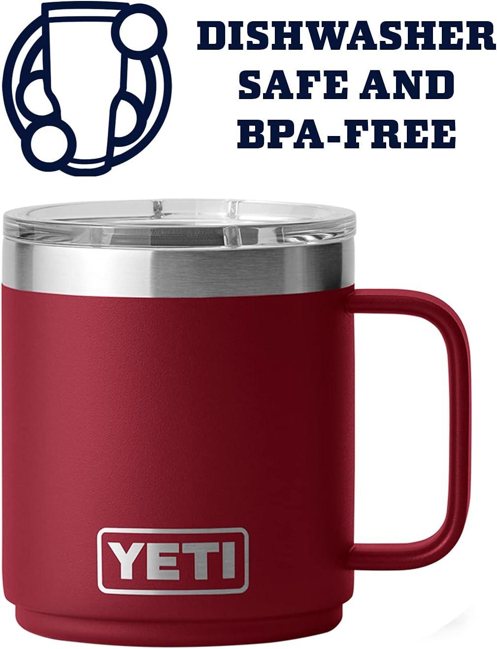 The YETI 10 oz. Rambler Mug stands 4 inches high and has a lip diameter of 3.5 inches, and with the handle its almost 5 inches’ wide