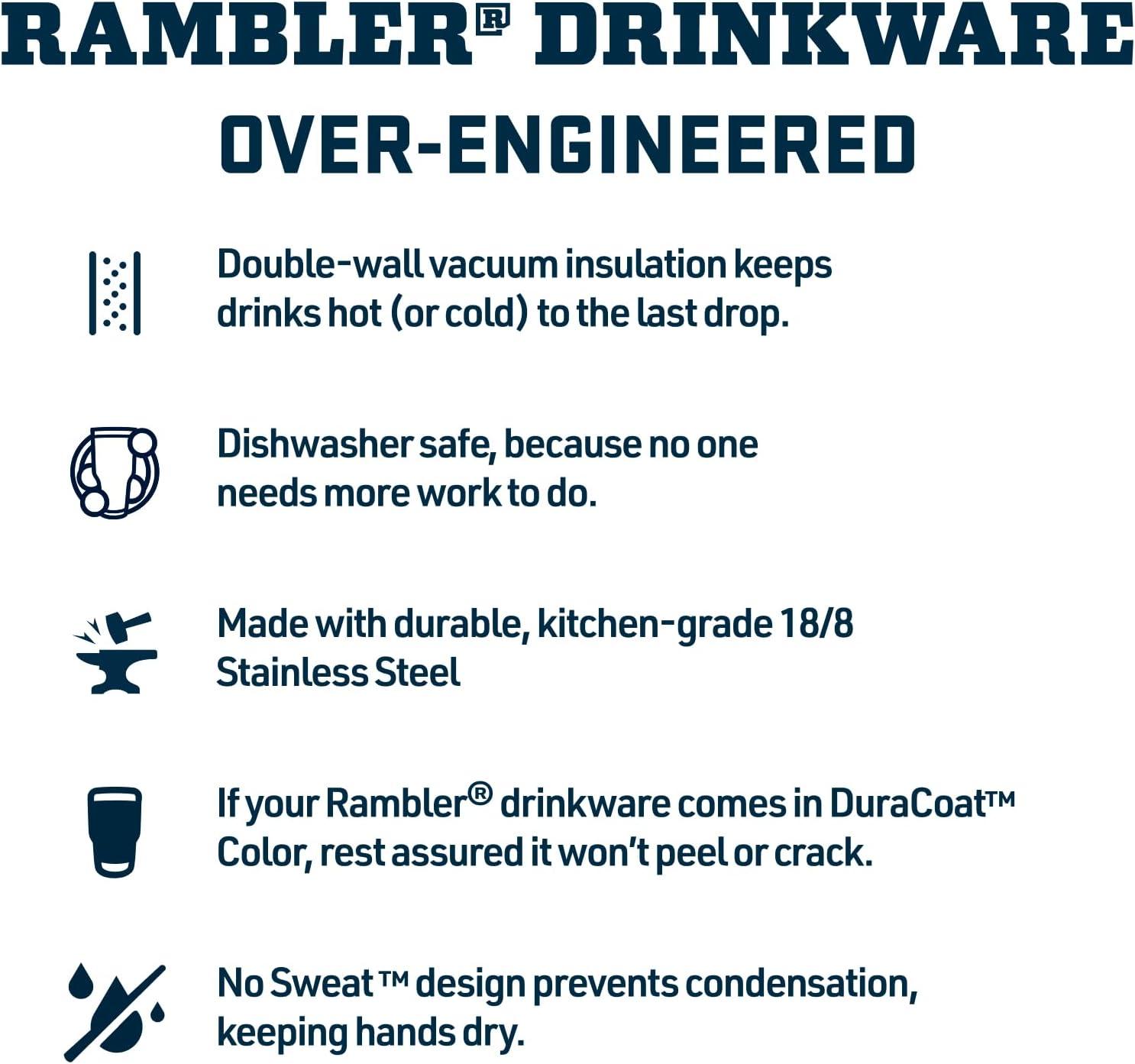YETI Ramblers are BPA-free, dishwasher safe, and have a No Sweat Design to make sure your hands stay dry. The tough Duracoat coating on the colored tumblers won’t crack, peel or fade