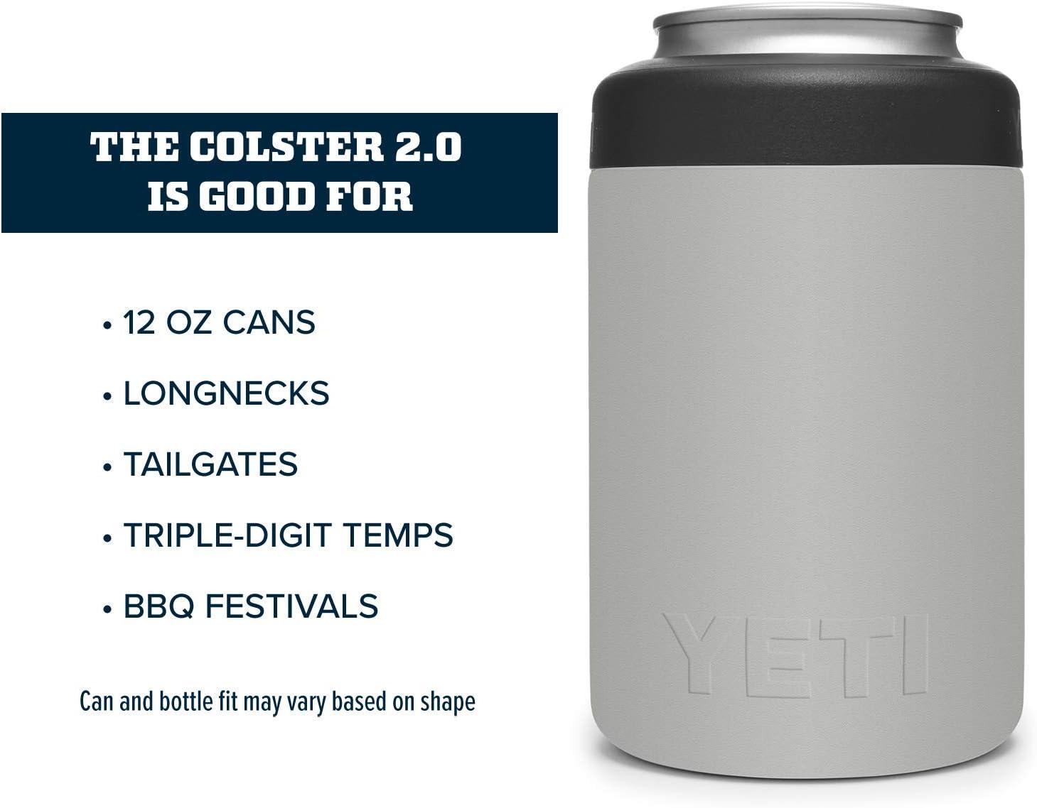 The YETI Standard Colster 2.0 is good for: Standard 12 oz. Cans, Longnecks, Tailgates, Triple-digit temps and BBQ festivals. Can and bottle fit may vary based on shape