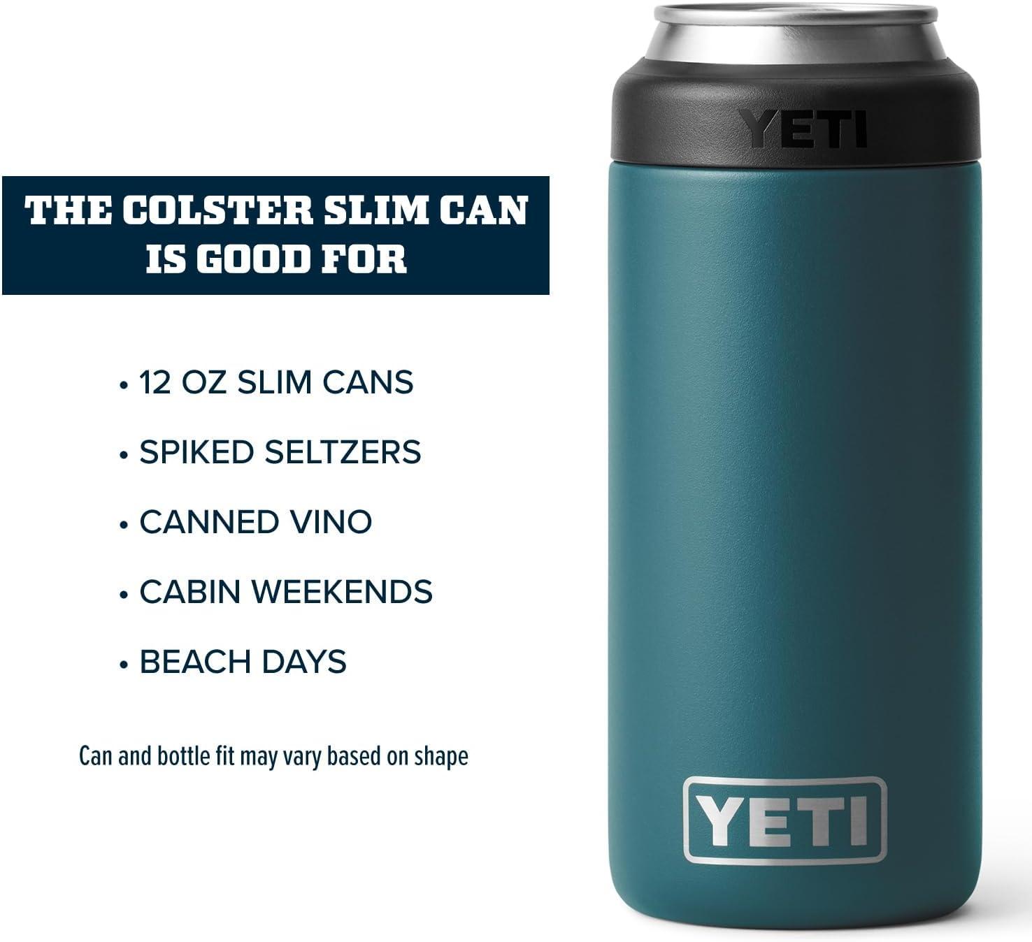 The YETI Slim Colster is good for: 12 oz Slim Cans, Spiked Seltzers, Canned Vino, Cabin Weekends and Beach Days. Can and bottle fit may vary based on shape