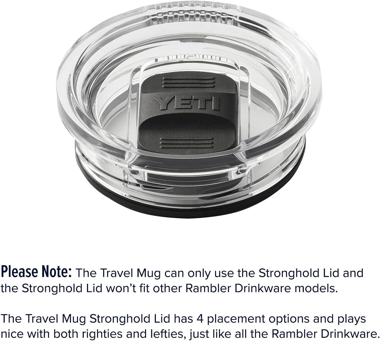 Please Note: The Travel Mug can only use the Stronghold Lid and the Stronghold Lid won’t fit other Rambler Drinkware models. The Travel Mug Stronghold Lid has 4 placement options and plays nice with both righties and lefties.
