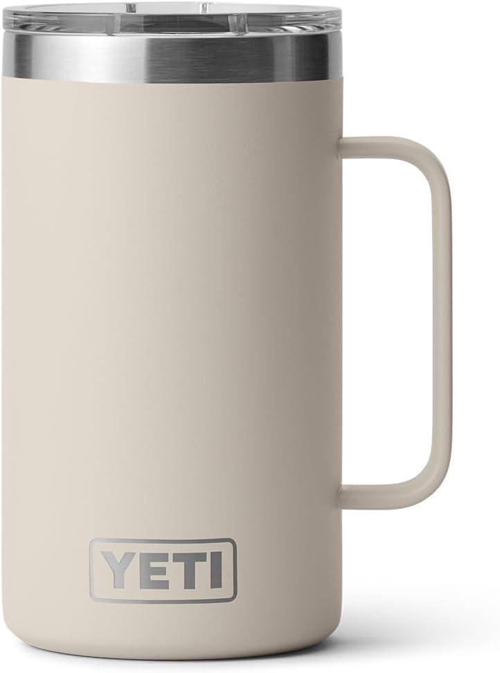 The YETI 24 oz. Rambler Mug stands 6.4 in high and has a lip diameter of 4.6 in, and with the handle its 5 inches wide