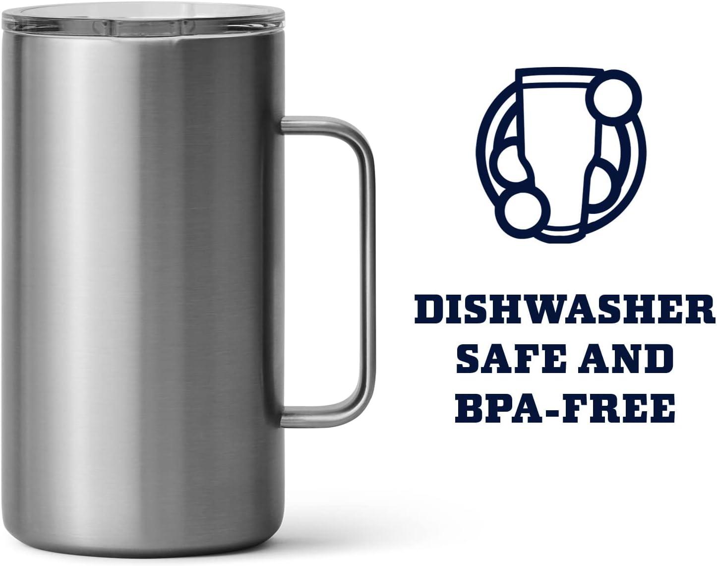 The YETI 24 oz. Rambler Mug stands 6.4 in high and has a lip diameter of 4.6 in, and with the handle its 5 inches wide