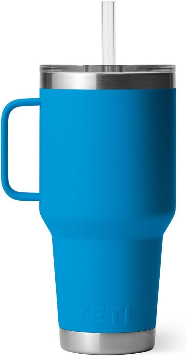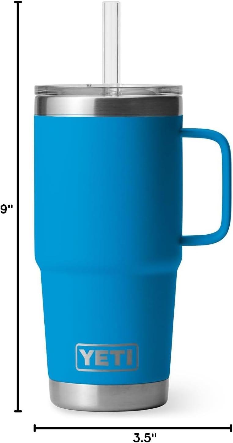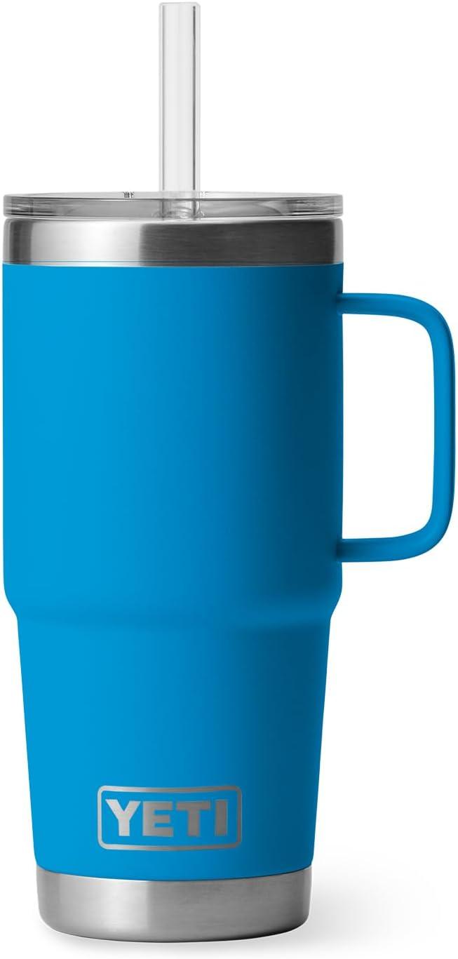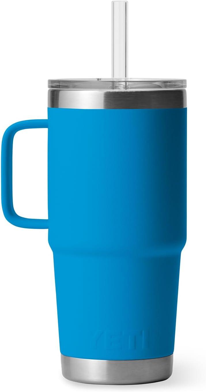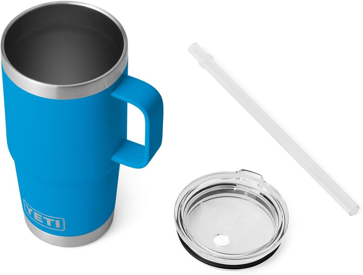 YETI Rambler 25 oz Tumbler with Handle and Straw Lid, Travel Mug Water Tumbler, Vacuum Insulated Cup with Handle, Stainless Steel, Rescue Red(Big Wave Blue)