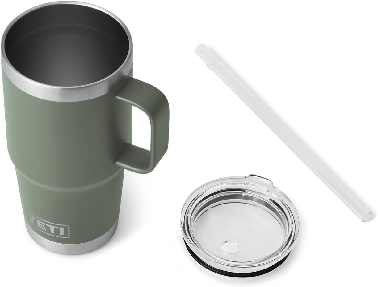 YETI Rambler 25 oz Tumbler with Handle and Straw Lid, Travel Mug Water Tumbler, Vacuum Insulated Cup with Handle, Stainless Steel, Rescue Red(Camp Green)