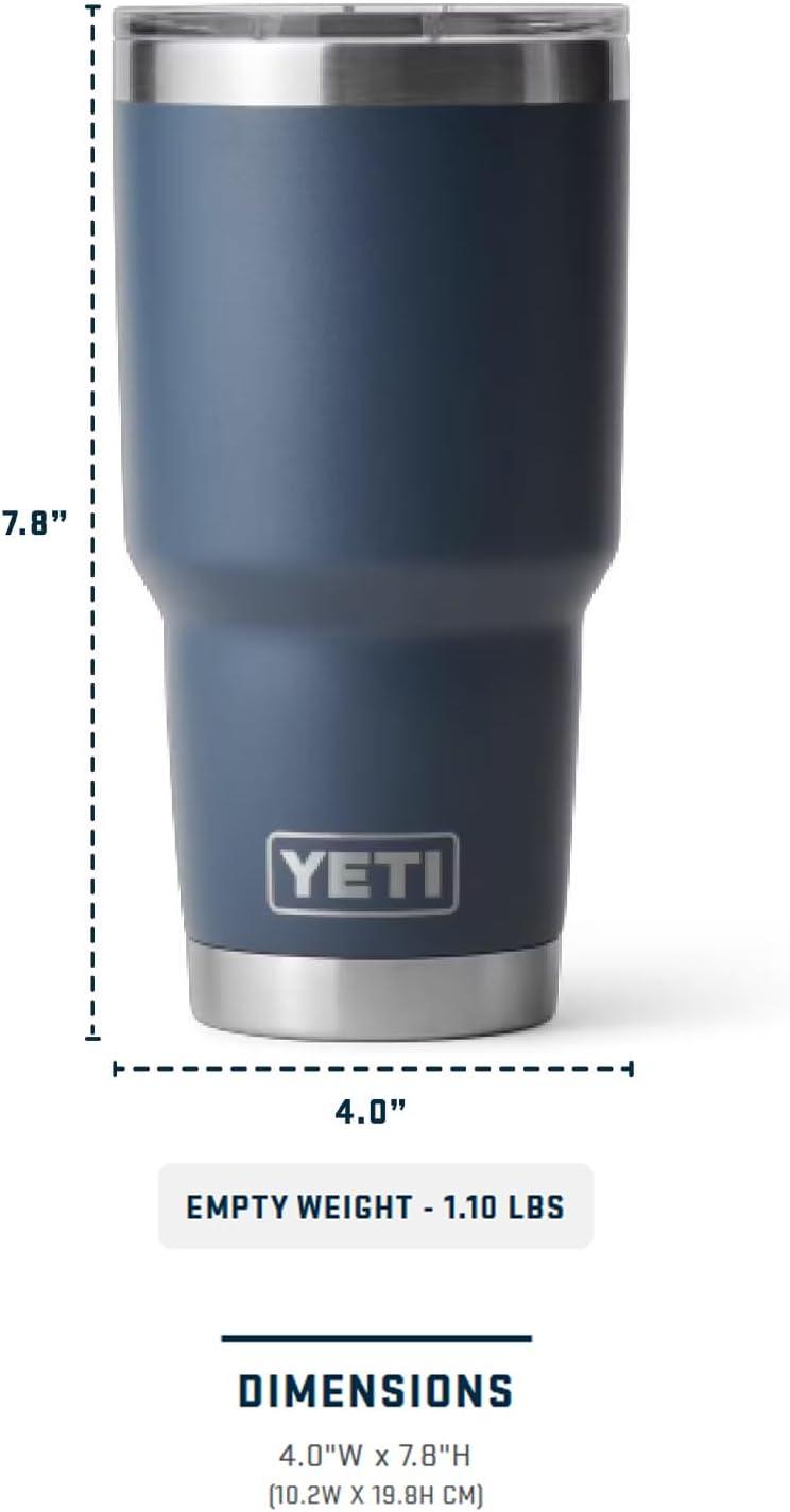 The YETI 30 oz Rambler Tumbler stands 7 5/8 in high and has a lip diameter of 4 in. All YETI Tumblers are sized to fit in standard sized cup holders