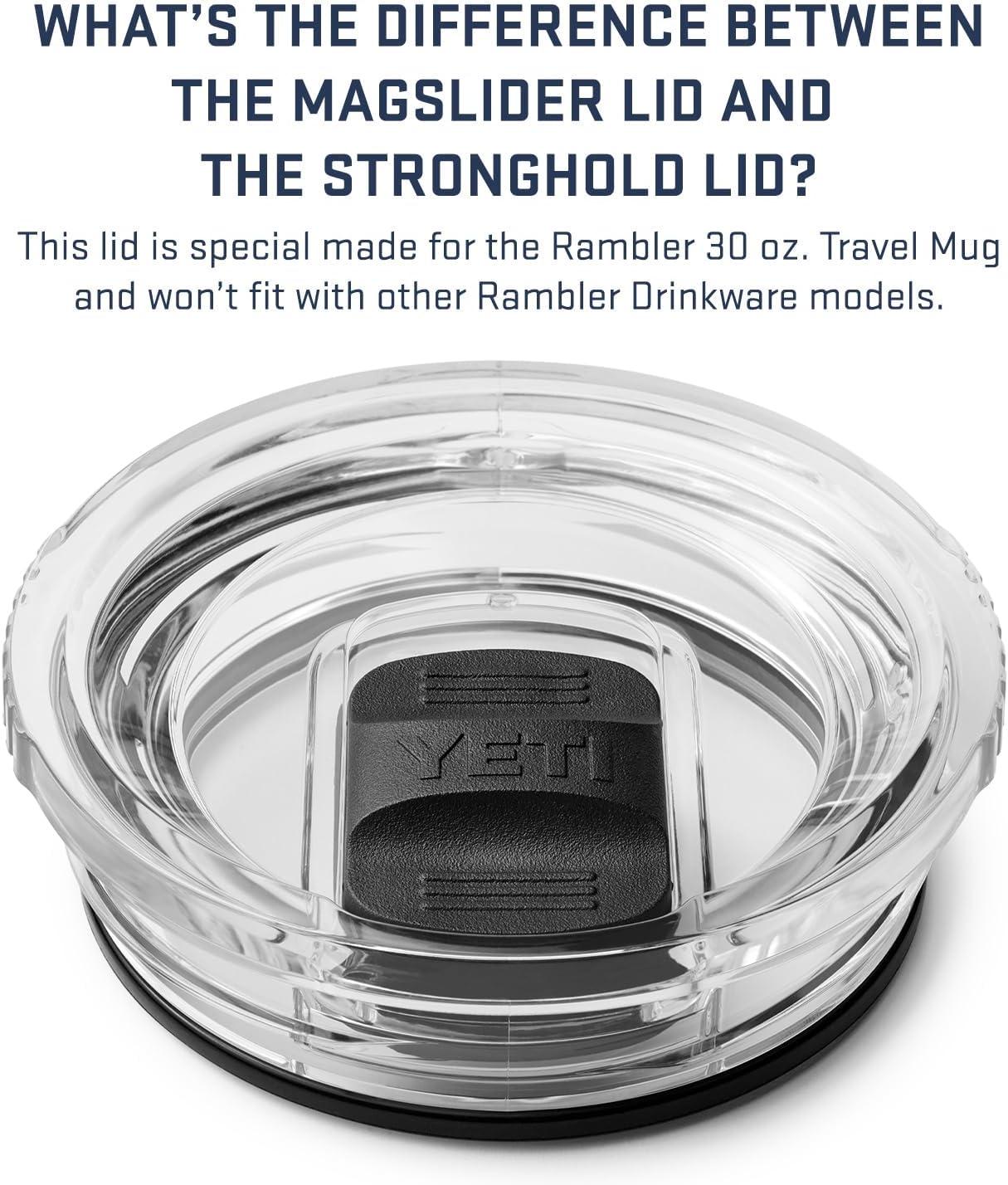 Please Note: The Travel Mug can only use the Stronghold Lid and the Stronghold Lid won’t fit other Rambler Drinkware models. The Travel Mug Stronghold Lid has 4 placement options and plays nice with both righties and lefties.