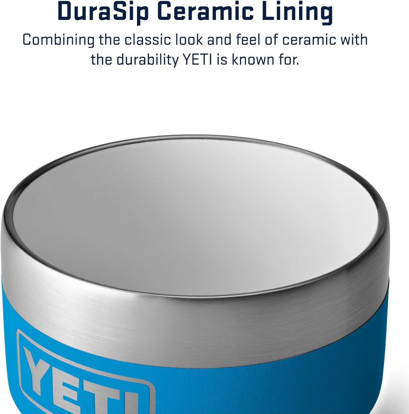 DURASIP CERAMIC LINING – Combining the classic look and feel of ceramic with the durability YETI is known for, DuraSip Ceramic Lining is fused to 18/8 vacuum insulated stainless steel, making it tough enough to take tumbles and keep on sipping