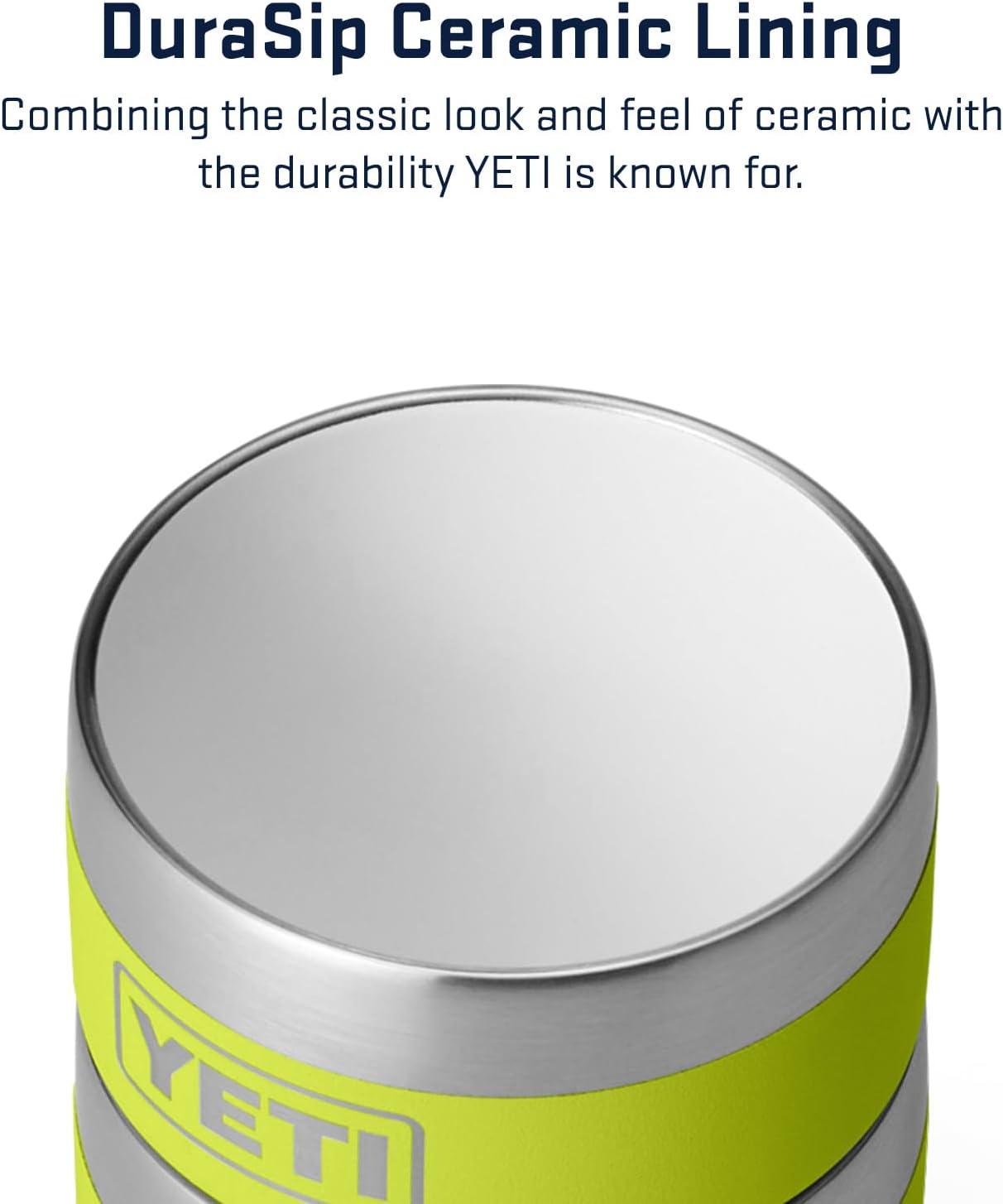 DURASIP CERAMIC LINING – Combining the classic look and feel of ceramic with the durability YETI is known for, DuraSip Ceramic Lining is fused to 18/8 vacuum insulated stainless steel, making it tough enough to take tumbles and keep on sipping