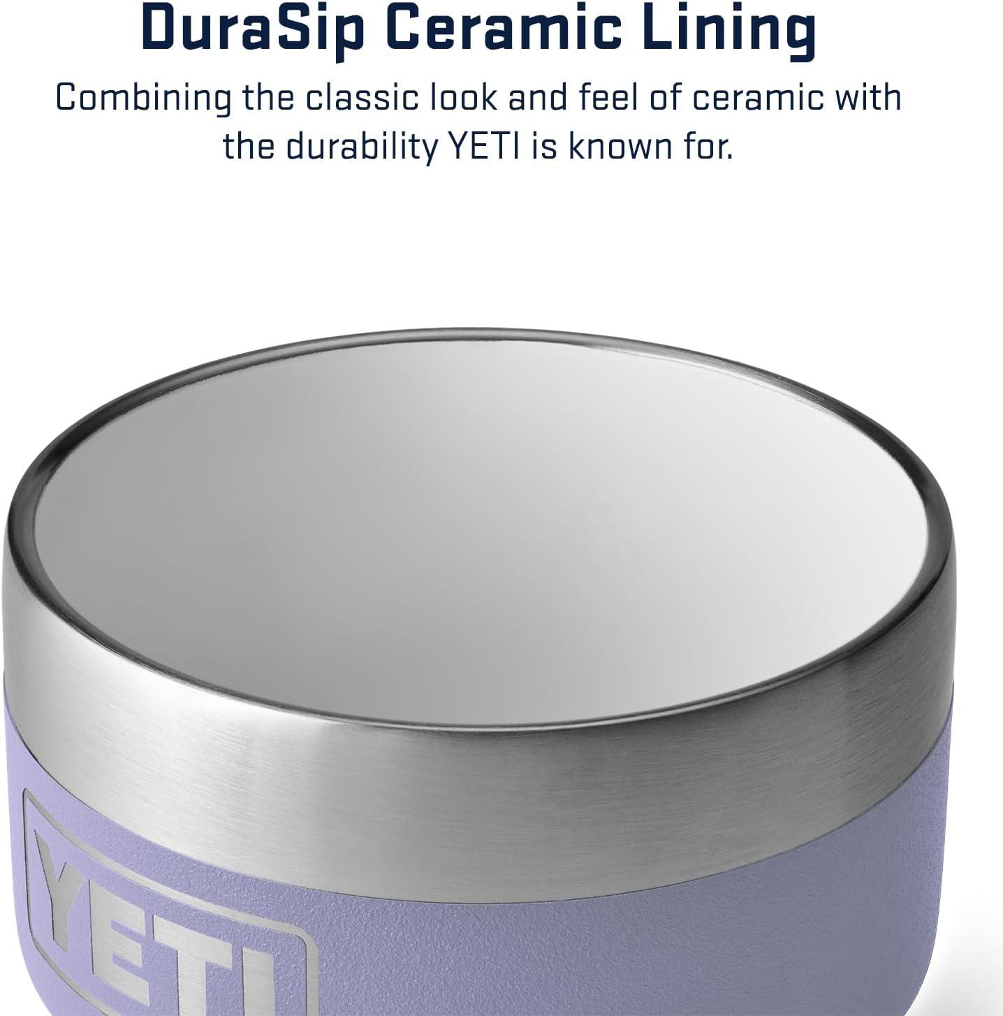 DURASIP CERAMIC LINING – Combining the classic look and feel of ceramic with the durability YETI is known for, DuraSip Ceramic Lining is fused to 18/8 vacuum insulated stainless steel, making it tough enough to take tumbles and keep on sipping